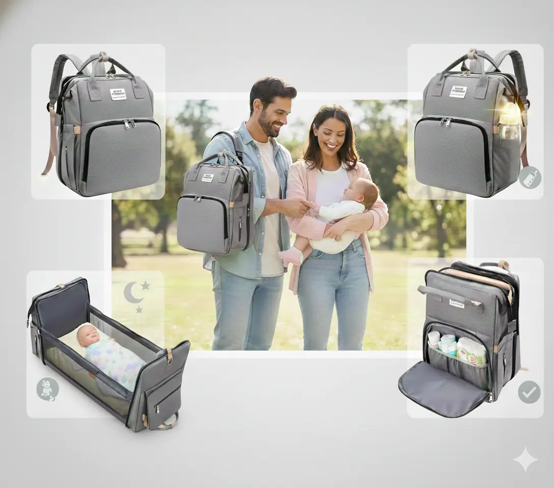 Modelo: Mochila Maternal 3 en 1 (Pañalera + Cuna + Mudador). 🎒